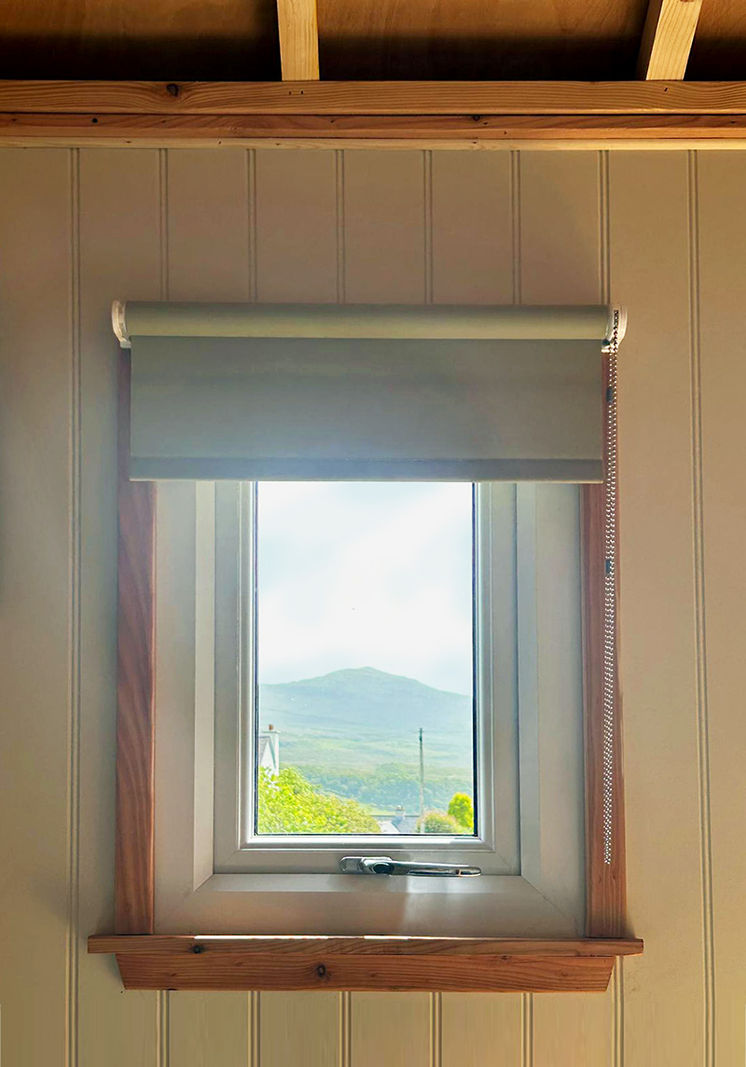 Inside, you'll find a spacious king-size bed with plush bedding, designed for deep rest and relaxation. Windows frame sweeping views of the surrounding landscape — to your right, one of the majestic Cuillin mountains, and straight ahead, the striking peak of Ben Tianavaig.